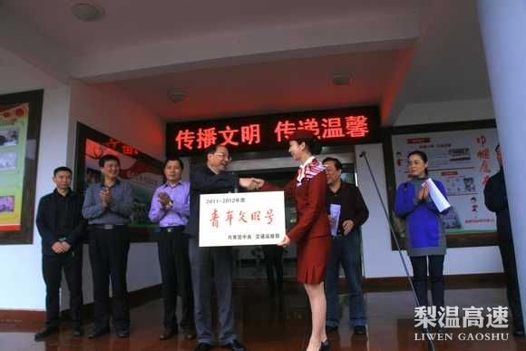 近日,梨温高速鹰潭西收费站被共青团中央、中国交通运输部联合授予2011-2012年度“全国青年文明号”荣誉称号,这是该站继2007年度获“全国青年文明号”后再次获评此项荣誉。4月17日上午,梨温公司在鹰潭西收费站举办简单授牌仪式,省交通运输厅副厅长万明为该站授牌,厅机关党委副书记秦炜婷宣读了表彰决定。