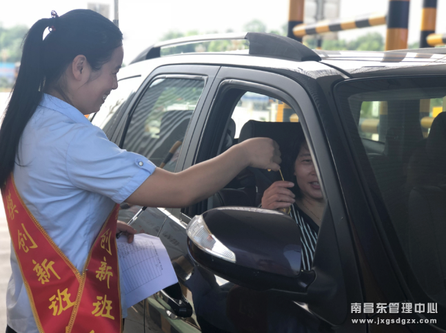6月18日上午,劳模创新班组成员们端着精心准备好的粽子和茶叶蛋来到收费车道,分发给过往司乘人员,为他们送上浓厚的端午祝福。同时,结合“沿着江西高速去旅行”微信公众号推广活动,推荐过往司乘扫码关注公众号,参加抽奖活动。