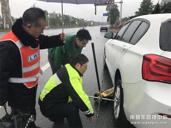 收费员为了不影响后面车辆的快速通行,一边熟练的操作收费程序一边安慰司机,并第一时间通知班长出口道有司机需要帮助。班长把车引导至收费站广场安全地带,得知司机是从浙江返程回江西九江过年的,在高速上发现左后轮没气才选择就近下高速。值班站长和班长带着本站的修车工具冒着雨帮助司机更换轮胎。最后,年轻司机感动万分,连声说“谢谢.......你们高速人真是活雷锋”。