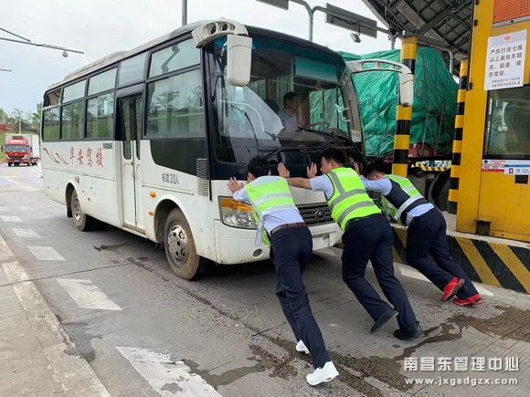 4月28日,在经开区收费站,一辆车牌为赣E的30座大型客车在经过经开区收费站上高速时突发故障,停在车道内无法启动。当班班长熊明发现该车停止不动时,立即上前查看情况,发现车辆无故熄火发动不了了,由于车辆停靠位置不当,存在较大的安全隐患,熊明立即组织增开车道,带领其他二名班员帮助车主将故障车辆推出车道,直至抵达外广场安全地带,并及时帮助司乘联系最近的修理厂。经过半个多小时的维修,车辆终于恢复正常行驶,司机表达谢意后,开心的驶上了路途。小伙子们目送着司机开车离开,又踏上了工作岗位。
