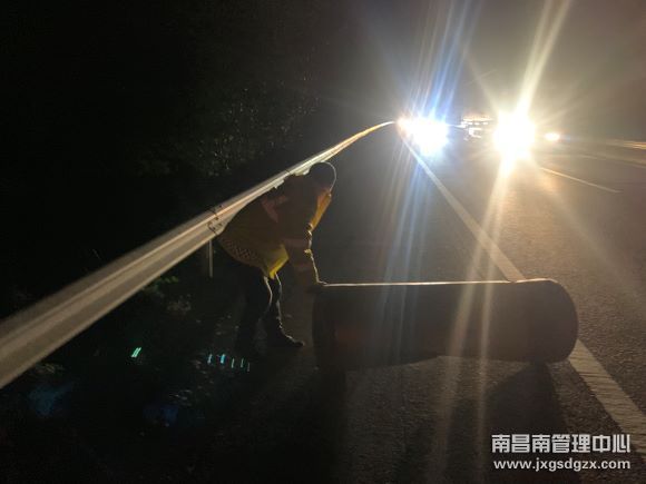 镜头五:拍摄者,蒋诗发。玉山养护站工作人员站在夜间巡查途经沪昆高速K486+200上海方向时,发现行车道上横着一条大铁桶,当时车流较大,严重影响行车安全,养护站的同志立即下车清理掉了路面障碍物,及时消除行车安全隐患。