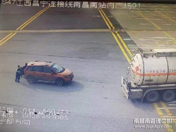 12月20日14时10分,南昌南管理中心信息分中心当班监测员正在日常视频巡检时发现,在南昌南收费站距离出口车道约20米处,一辆橘色小车打着双闪停在出口广场处。