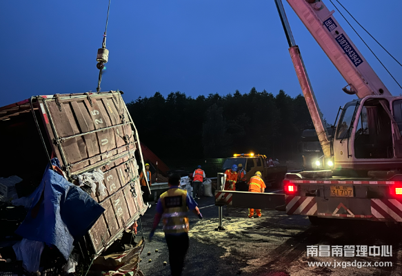 6月14日凌晨3点10分许,在沪昆高速上海方向K551公桩处发生2起追尾事故,其中2辆中小型货车侧翻,导致所有车道无法正常通行,南昌南车辆救援大队杨梅岭中队快速出击,迅速将高速路面恢复安全畅通。