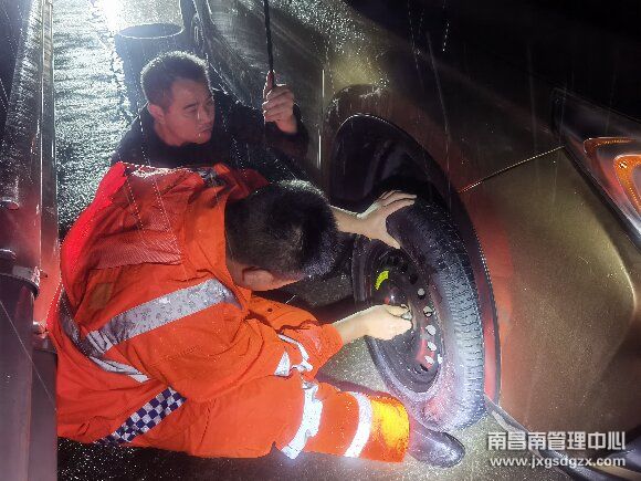 5月4日22时左右,南昌南车辆救援大队鹰潭中队管辖路段突降大雨,该中队巡查至上海方向K582公桩处时,发现一台小车正打着双闪灯停在应急车道内,经询问故障车前轮发生爆胎司机正在更换备胎。