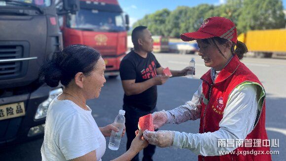 司机接过西瓜,连声道谢:“坐在车里热得够呛,吃了这西瓜真凉爽,你们的服务太贴心了!”