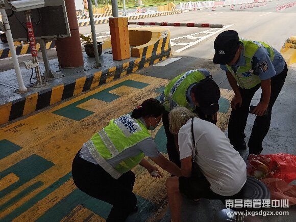 7月17日,一个佝偻的身影出现在南昌南管理中心弋阳收费站的车流中,当班班长发现情况后疾步上前查看。