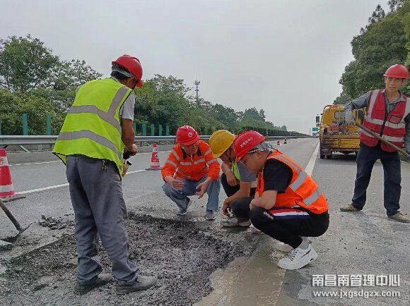 近日,强降雨天气多发,南昌南管理中心东乡养护所杨梅岭养护站所辖区域非四改八路段多处路面出现坑槽。为确保道路安全与畅通,该站积极抢抓晴好天气,迅速开展路面修补工作。
